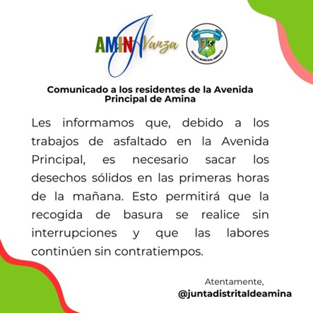 Les informamos que, debido a los trabajos de asfaltado en la Avenida Principal, es necesario sacar los desechos sólidos en las primeras horas de la mañana. Esto permitirá que la recogida de basura se realice sin interrupciones y que las labores continúen sin contratiempos.